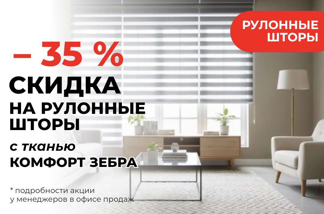 Скидка 35% на все системы рулонных штор с тканью Комфорт зебра (белый, магнолия, капучино, серый).